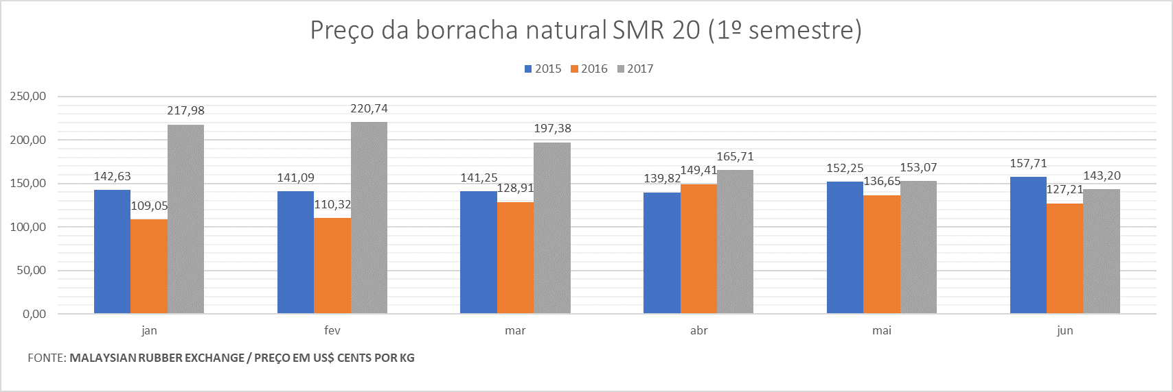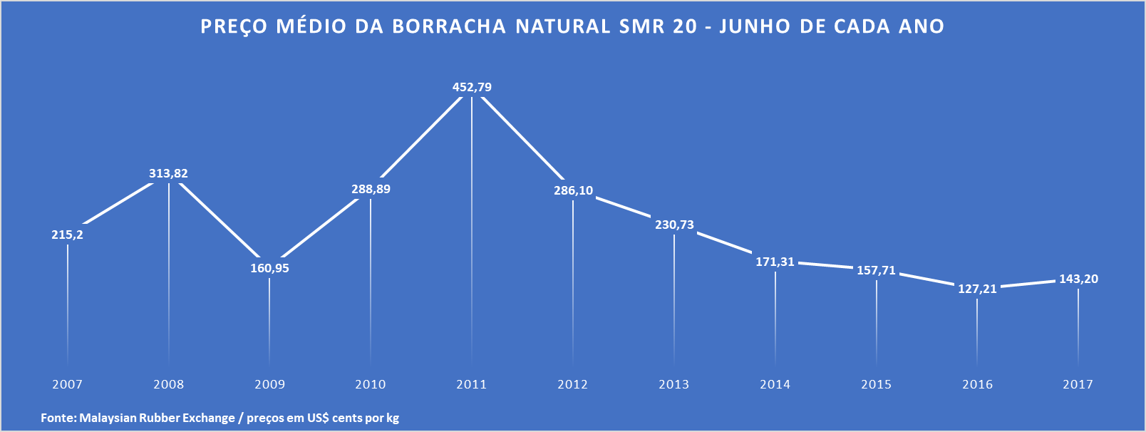 O preço médio da borracha natural SMR 20, a mais utilizada pela indústria de pneumáticos, encerrou o mês de junho cotada a 143,20 US$ cents o quilo na Malaysian Rubber Exchange, valor que reflete baixa de 6,44% ante o fechamento do mês de maio e expressivo recuo de 34,30% ante o preço médio da commodity negociada em janeiro deste ano.