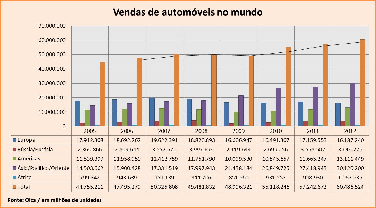 Ásia (30.120.200 unidades vendidas em 2012), Europa (16.187.240 unidades), Américas (13.111.449 unidades) Rússia/Eurásia (3.649.726 unidades) e África (1.067.635 veículos), fazem o perfil geográfico do setor automotivo global, por sequência e quantidade de vendas.