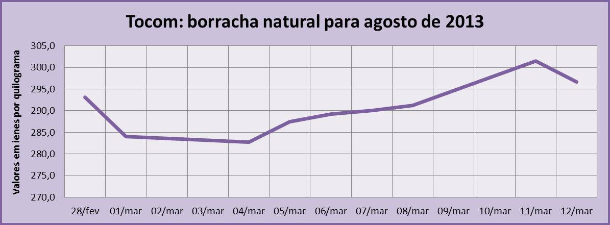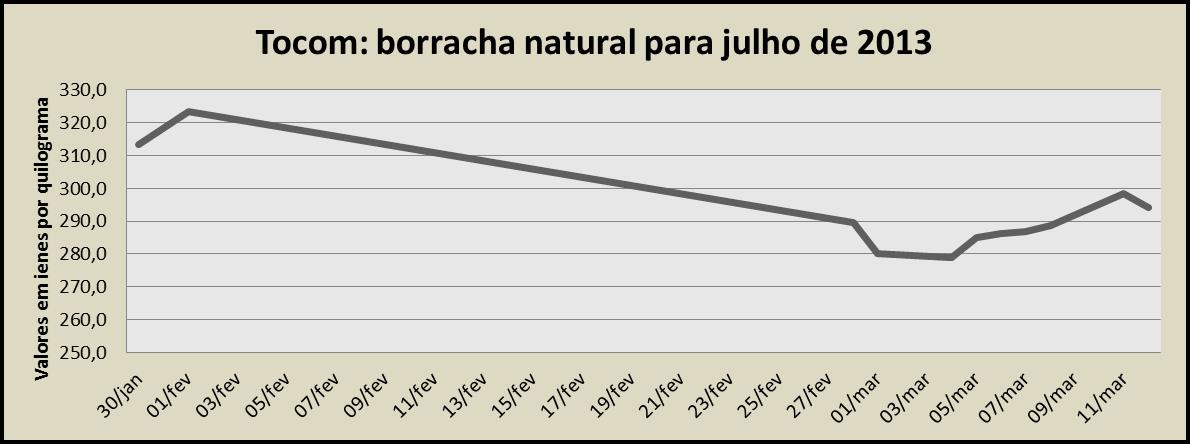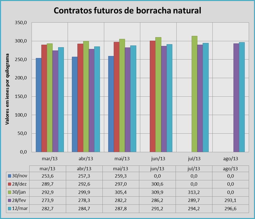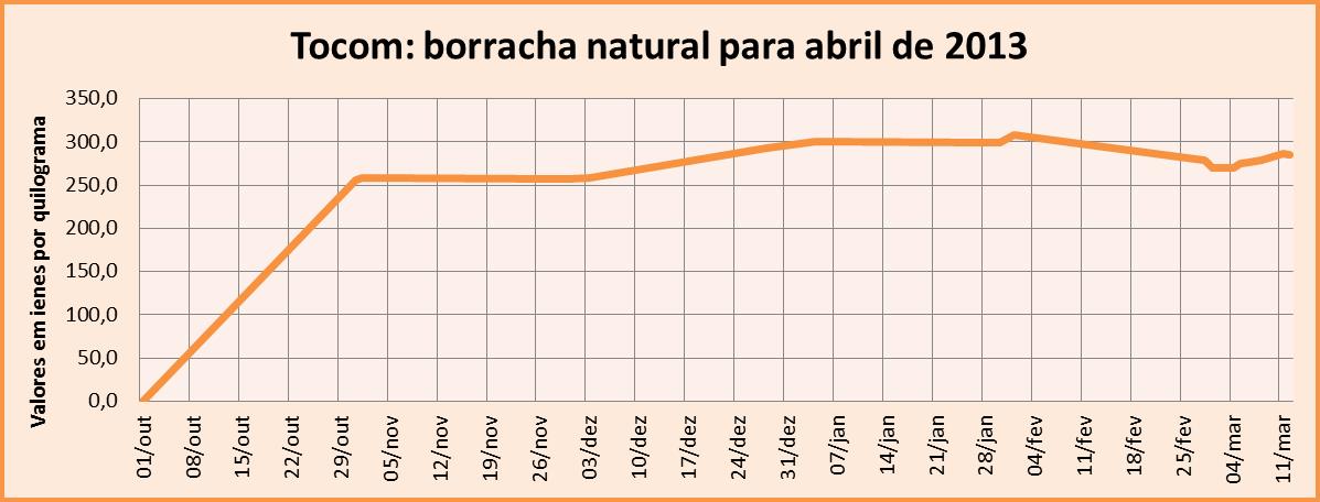 A borracha natural para entrega em abril apresenta valorização de 2,30% no pregão da bolsa de Tóquio em relação a 28 de novembro e 10,65% em relação ao início das operações com contratos para esse mês, em novembro do ano passado. O pico de preço ocorreu em 30 de janeiro, para 299,9 ienes por quilograma (R$ 6,08 pelo câmbio atualizado). Em 12 de março os contratos são negociados a 284,7 ienes por quilograma (R$ 5,78).
