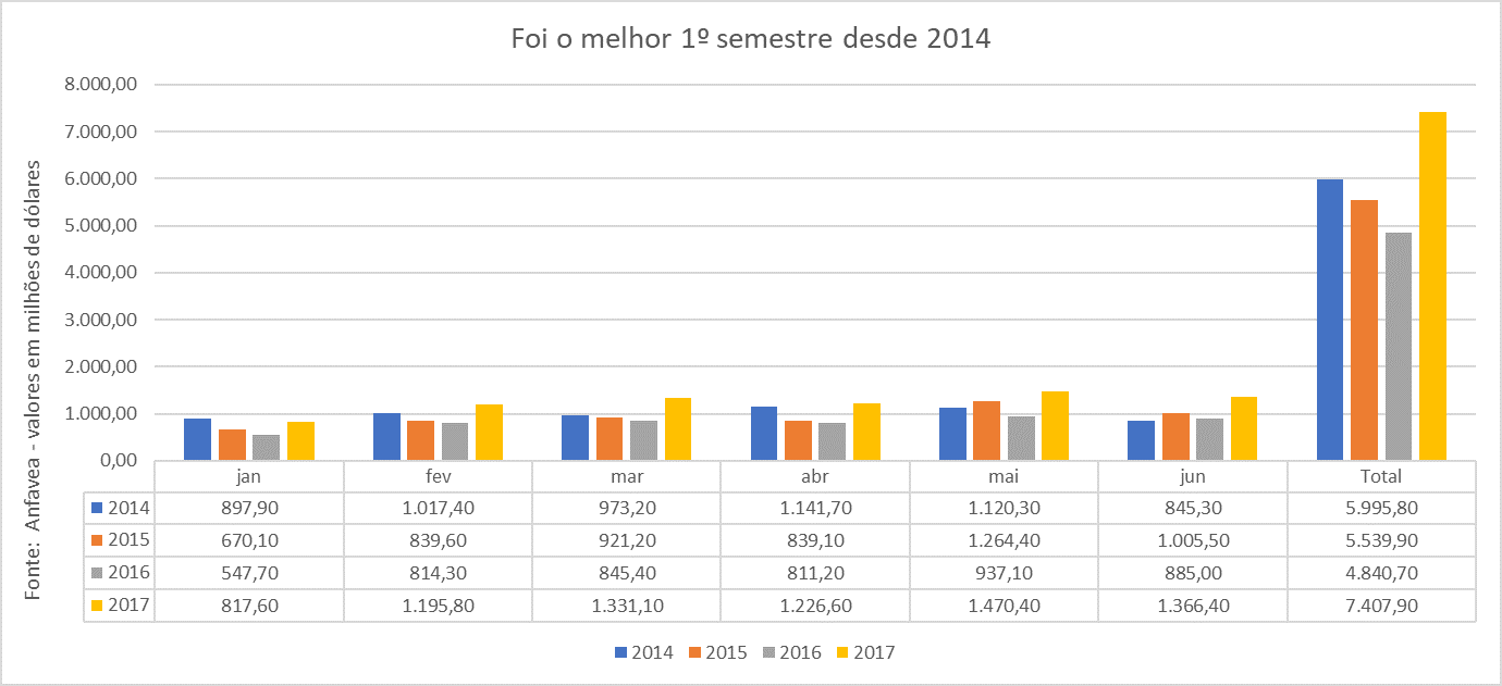 Em unidades exportadas, a indústria embarcou 373.563 unidades no primeiro semestre, ou 57,2% a mais que as 236.491 unidades exportadas nos primeiros seis meses do ano passado.