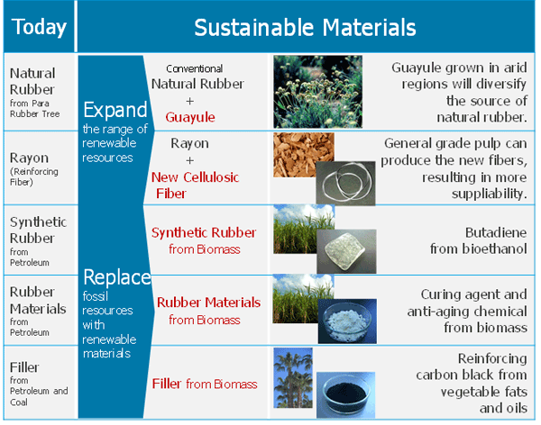 Dessas mudanças na produção dos compostos está a borracha sintética, o negro de carbono e outros componentes que antes eram provenientes do petróleo e passaram a ser produzidos a partir de biomassa.