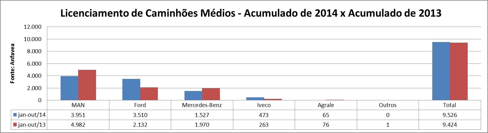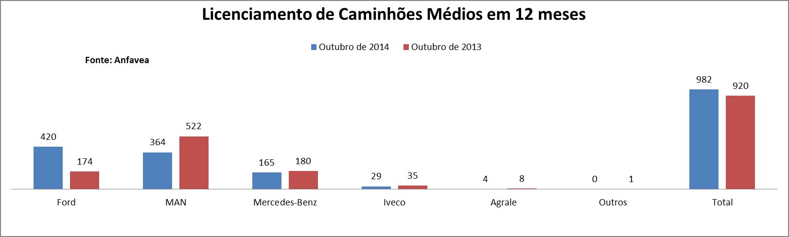 A Iveco vendeu no acumulado de 2014 a soma de 473 caminhões médios ante 263 no mesmo período do ano passado. Já a Ford cresceu em bases muito mais sólidas. O salto foi de 2.132 unidades em 2013 para 3.510 no acumulado de 2014.
