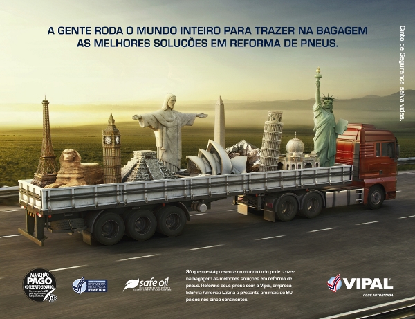 “A gente roda o mundo inteiro para trazer na bagagem as melhores soluções em reforma de pneus” é a nova peça publicitária desenvolvida pela agência Duplo, de Porto Alegre, para a Borrachas Vipal, empresa líder do setor de reformas de pneus da América Latina.