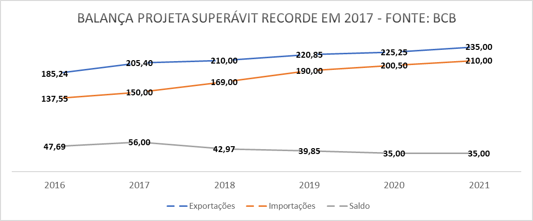 2017 pode encerrar com novo superávit recorde na balança comercial brasileira, dessa vez, de US$ 56 bilhões. O número faz parte das projeções de exportação e importação presentes nas estimativas do Banco Central do Brasil.