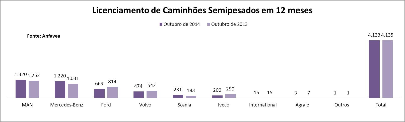 É o que mostra a Carta da Anfavea, boletim mensal distribuído pela Associação Nacional dos Fabricantes de Veículos Automotores (ANFAVEA) ao destacar um aumento de 12% nos licenciamentos de caminhões semipesados entre outubro contra setembro deste ano – ante recuo de 7% no acumulado do ano, comparativamente ao mesmo período do ano anterior.