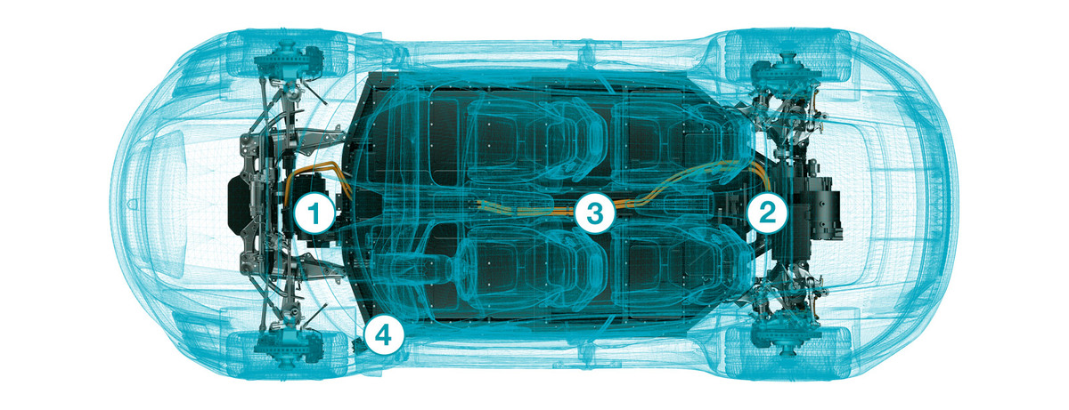 O carro-conceito Mission E tem dois motores elétricos (1, 2). A motorização de 800 Volts possibilita recarga rápida e grande alcance. A bateria de íon-lítio (3) integrada no fundo do veículo tem boa influência sobre a distribuição de carga e possibilita a recarga por meio de indução. A tomada de recarga convencional se encontra no para-lama (4) dianteiro esquerdo