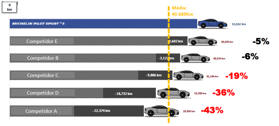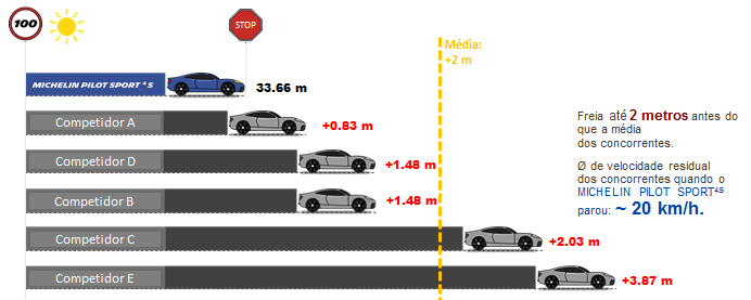Frenagem em piso seco – O Michelin Pilot Sport4 S precisa apenas de 33,66 metros para passar de 100 km/h a 0 km/h, o seu maior competidor direto demanda quase um metro a mais (+ 0,83 m).