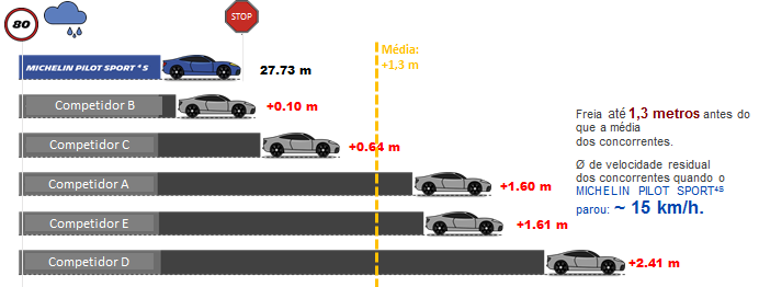 Frenagem em piso molhado – Em uma velocidade de 80 km/h, o novo pneu apenas precisa de 27,73 metros para parar o carro totalmente.