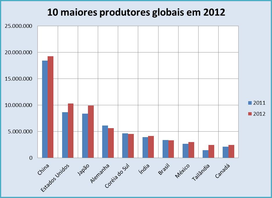 Por volumes gerais, China (19.271.808 unidades), Estados Unidos (10.328.884), Japão (9.942.711), Alemanha (5.649.269) e Coreia do Sul (4.557.738) foram os Top 5 do setor automotivo em 2012, e, juntos, representaram 59,1% da produção mundial. Ou seja, de cada 10 carros feitos no mundo, 5,9 saíram de uma dessas praças produtivas.