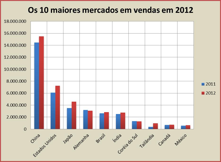 O Brasil figurou entre os 10 maiores mercados globais em 2012. Foi o sétimo maior mercado no ano passado. Antes do Brasil ficou a Índia com 4.145.194 unidades, depois o Brasil com 3.342.617, o México (3.001.974), a Tailândia (2.483.043) e o Canadá (2.463.732).