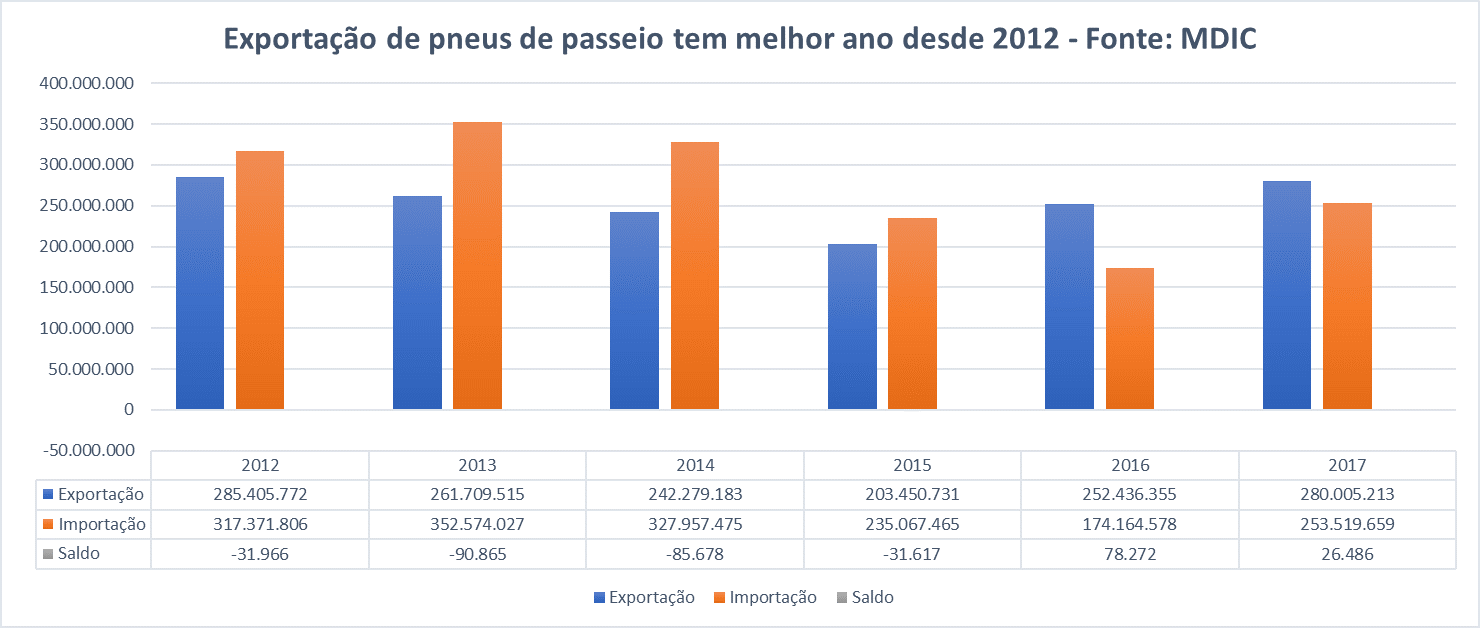 A indústria brasileira de pneus encerrou o período de janeiro a julho com o melhor resultado nas exportações de pneus de passeio, picapes e SUVs, desde 2013, com a geração de US$ 280 milhões em vendas ao exterior e superávit comercial de US$ 26,5 milhões no período, o segundo maior desde 2012.