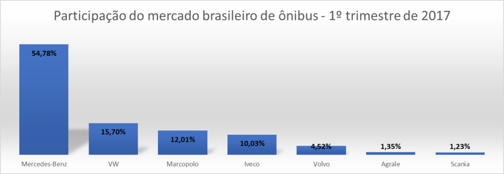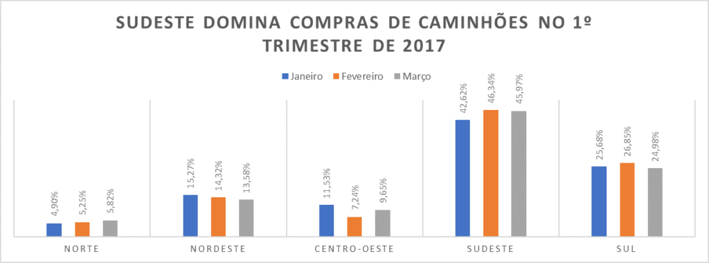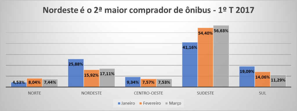 Neste primeiro trimestre, o grande mercado para a comercialização de ônibus foi o Nordeste, com participações de 25,8%, 15,9% e 17,1%, respectivamente em janeiro, fevereiro e março, atrás apenas da região Sudeste, que hoje fica com mais de 56,6% das aquisições de ônibus do mercado nacional.