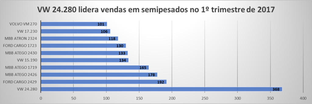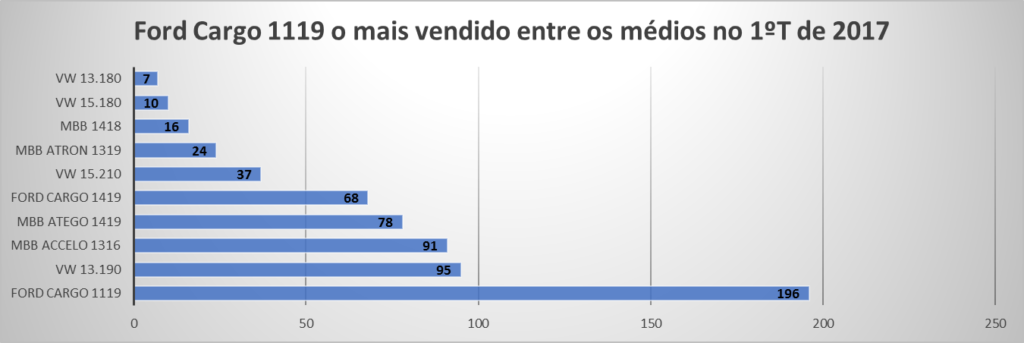 No segmento de caminhões médios a Ford lidera com o Cargo 1119, com mais de 100 unidades afrente do VW 13.190, uma diferença que a Volkswagen Caminhões devolve com larga vantagem no segmento semipesado, através da liderança do VW 24.280, com quase o dobro de unidades vendidas sobre o Ford Cargo 2429.