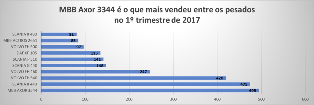 No segmento de pesados o jogo é muito mais equilibrado entre Mercedes-Benz, Scania e Volvo. Com exceção do Axor 3344, líder em vendas desse segmento, só da Scania e Volvo.