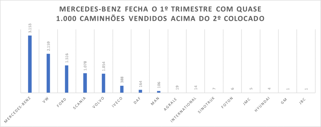 Apesar da liderança da Mercedes-Benz nos segmentos de caminhões e ônibus, com participações de 32,59% e 54,78% nos licenciamentos realizados entre janeiro, fevereiro e março, os números apurados pela Federação Nacional da Distribuição de Veículos Automotores (Fenabrave), revelam que essa liderança é acirrada em segmentos específicos.