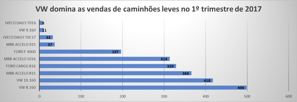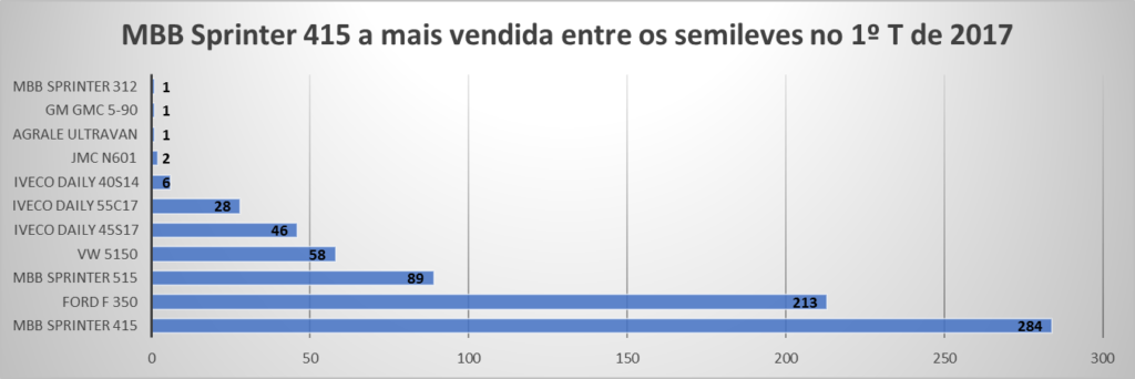 Em semileves, a Sprinter lidera, mas tem a F 350 da Ford como grande concorrente. Em caminhões leves, os VW 8.160 e 10.160 são os grandes páreos duros para a concorrência dos Mercedes-Benz Accelo 815 e 1016 e do Ford Cargo 816.