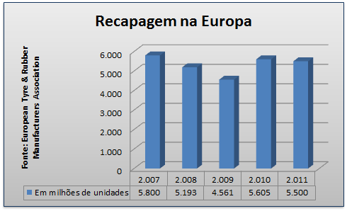 Estimativa da ETRMA (European Tyre and Rubber Manufacturers Association, na sigla em inglês), da Europa, aponta que o mercado de recapagem na Europa deve apresentar recuo de 1% no balanço de 2011 – o fechamento dos números ainda não foi feito.