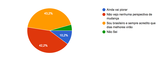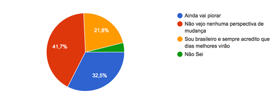 Apenas 21, 8% ainda acreditam que dias melhores virão, enquanto 41,7% não veem perspectivas de melhoras. 32,5% ainda acreditam que o cenário política vai piorar.
