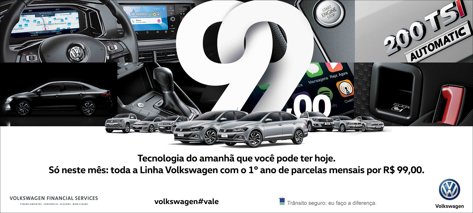 A campanha é válida para toda a linha Volkswagen e prevê entrada de 40% e taxa de 1,49%, com as 12 primeiras parcelas mensais de R$ 99,00 + 36 meses com o saldo restante.