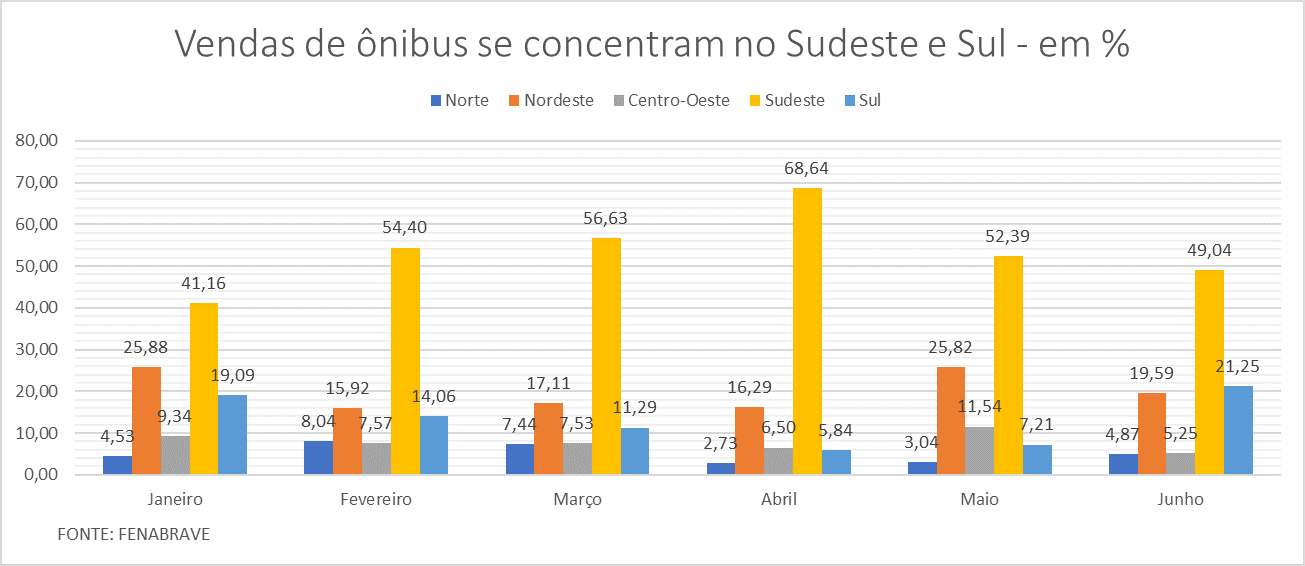Entre janeiro a junho deste ano foram emplacadas 6.464 unidades, refletindo queda de 7,25% – ante recuo de 15,6% na comercialização de caminhões. Comparada a junho do ano passado, as vendas de ônibus apresentam evolução de 30,38%. Já em relação a maio deste ano, alta de 18,60%.