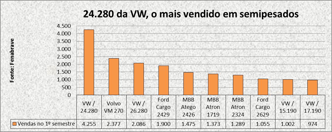 A Volkswagen Caminhões, com o modelo 24.280, encerrou o período de janeiro a junho com vendas totais de 4.255 unidades do modelo, o que representa 79% a mais se comparado ao segundo colocado em vendas, o Volvo VM 270, que teve 2.377 unidades vendidas no mesmo período.
